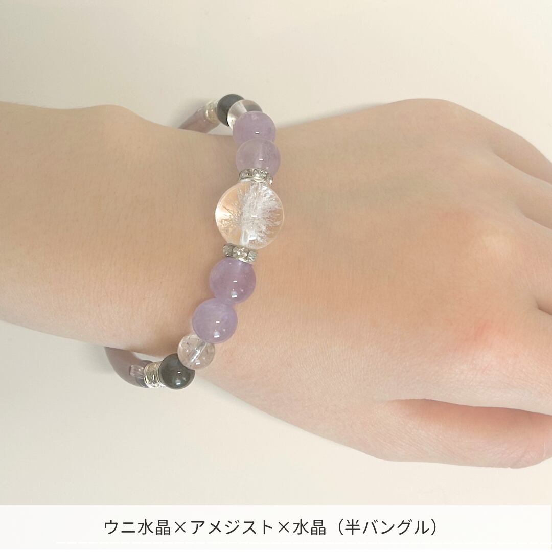 【強くなりすぎないお守り】 半バングル(カルセドニー)× ブラックトルマリン × アメジスト × ウニ水晶