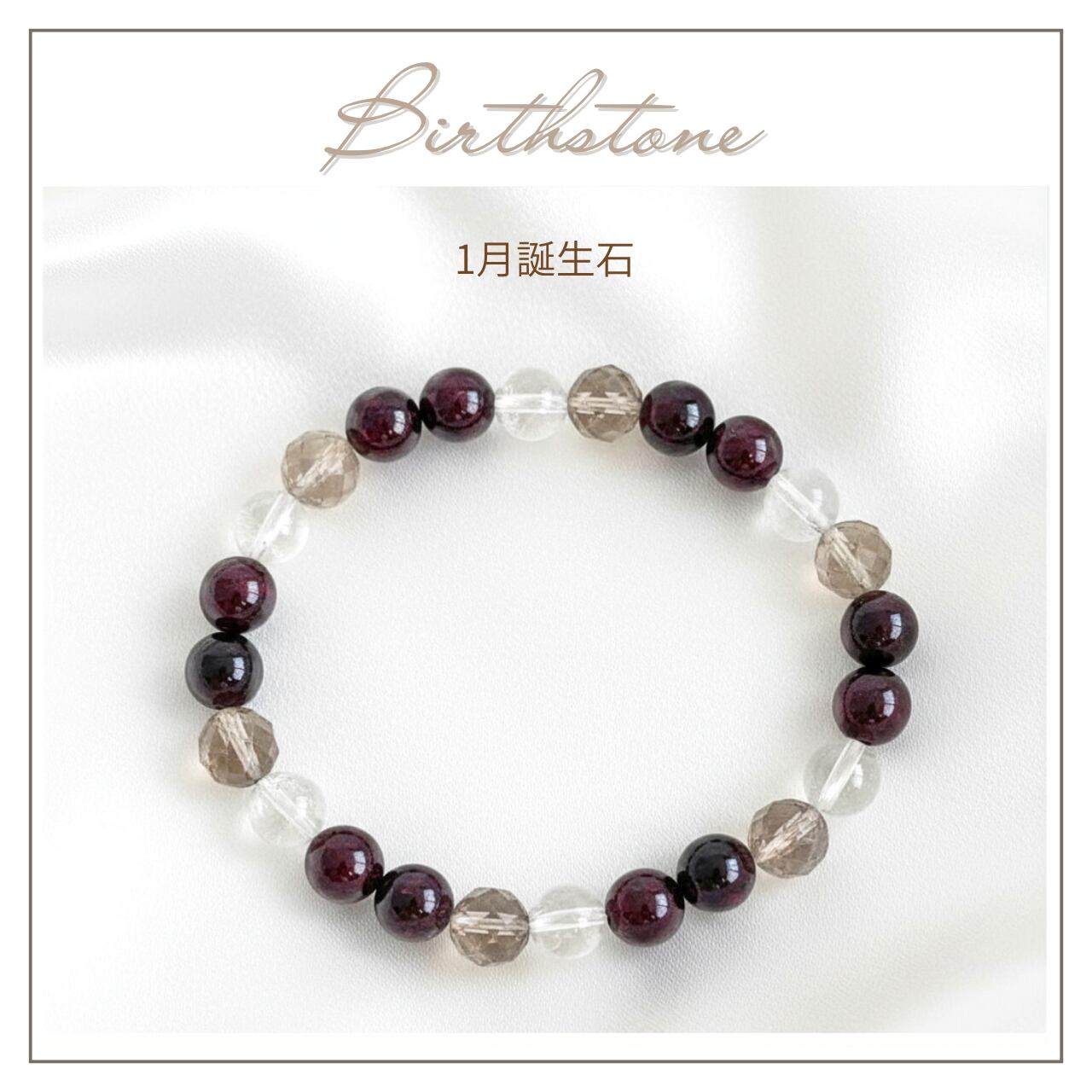 「☆1月生まれのあなたへ」は、1月の誕生石ガーネットを中心に、スモーキークオーツと水晶を組み合わせた特別なブレスレットです。これにより、身に着けることで心の安定を図り、ポジティブなエネルギーを引き出す力を感じられるアイテムです。