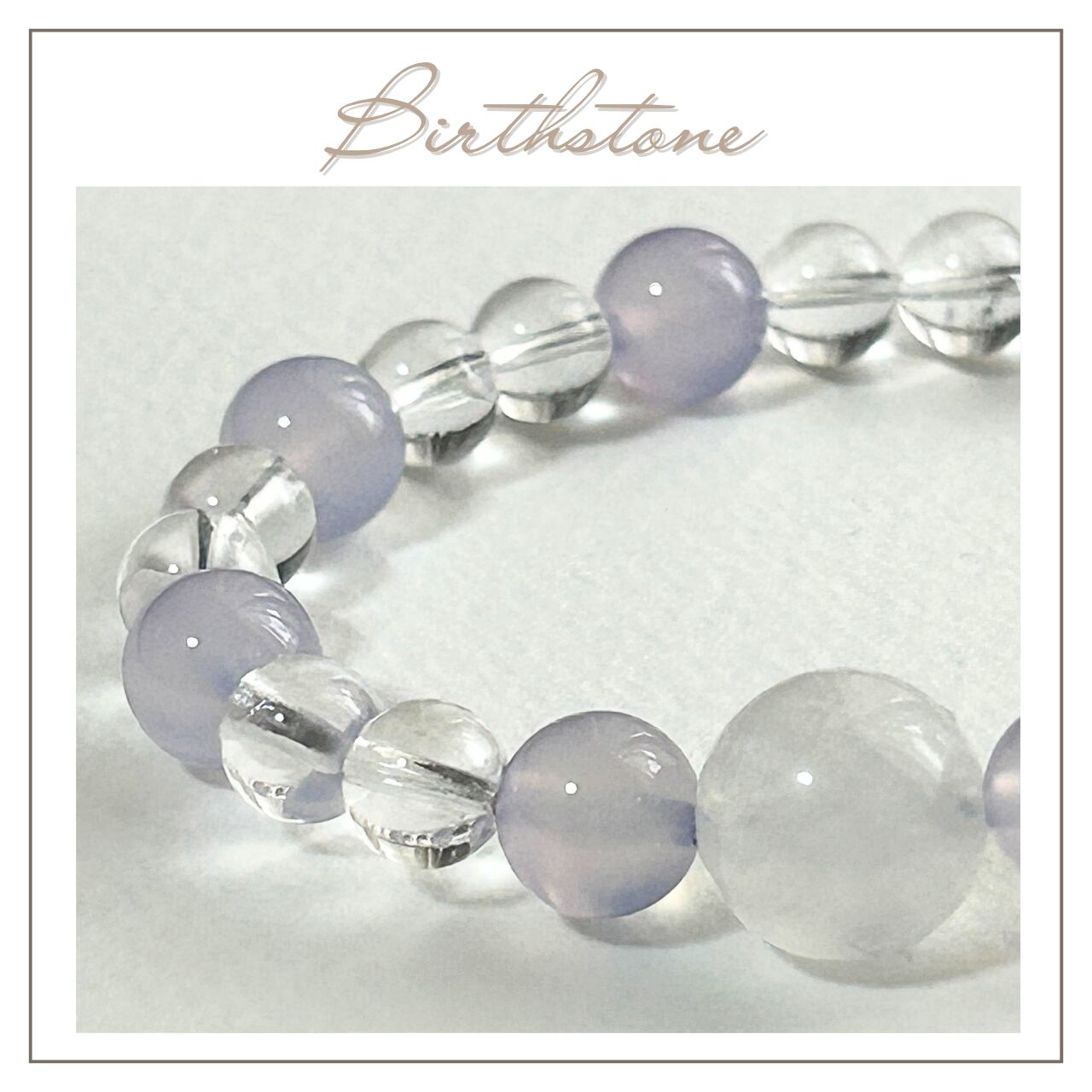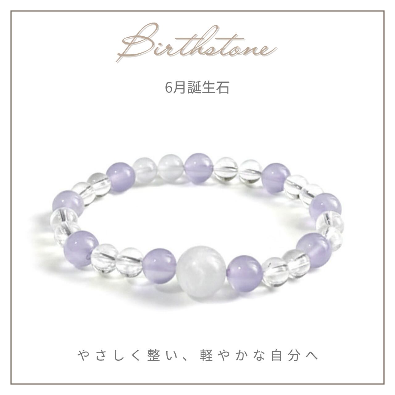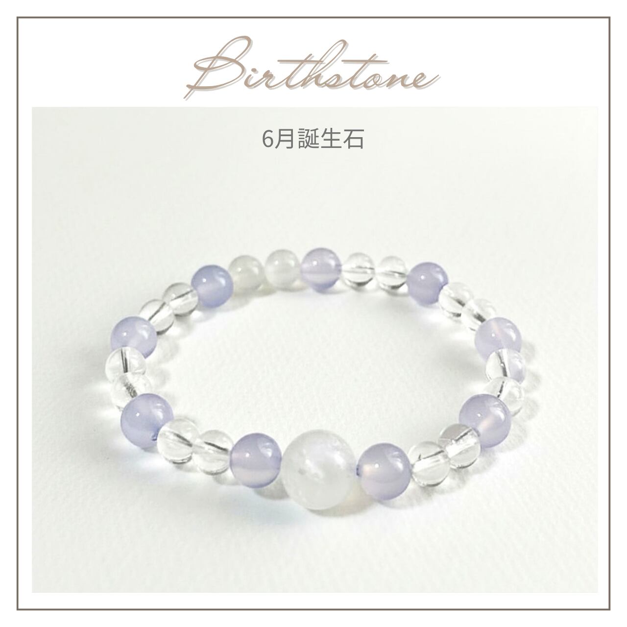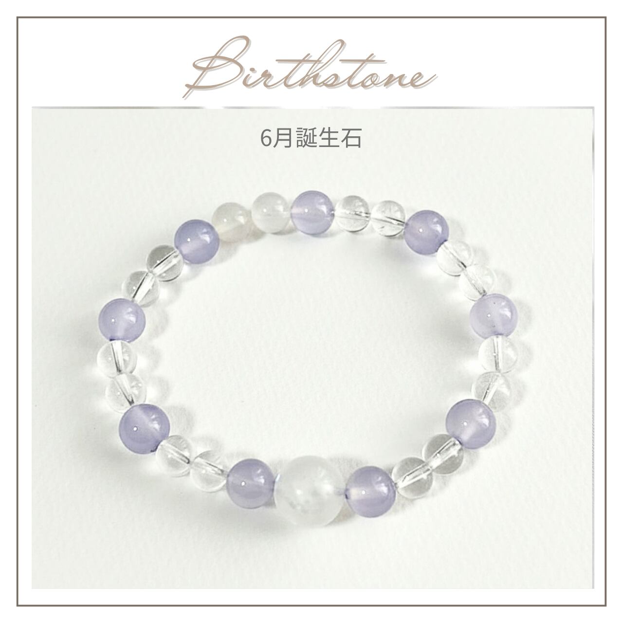 〜6月誕生石ブレスレット〜ムーンストーン、パープルカルセドニー、水晶を組み合わせた、穏やかで優美なブレスレットです。身に着けることで、あなたの日常にやわらかな癒しと安らぎをもたらすアイテムとしてお勧めいたします。