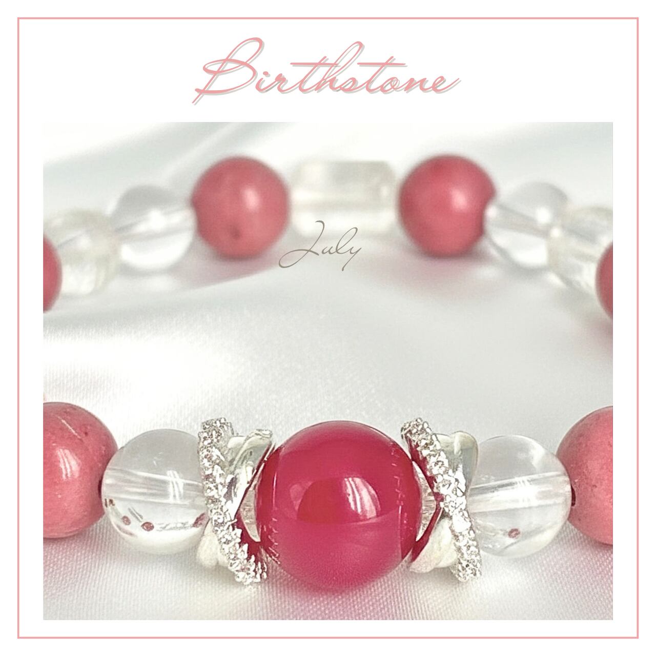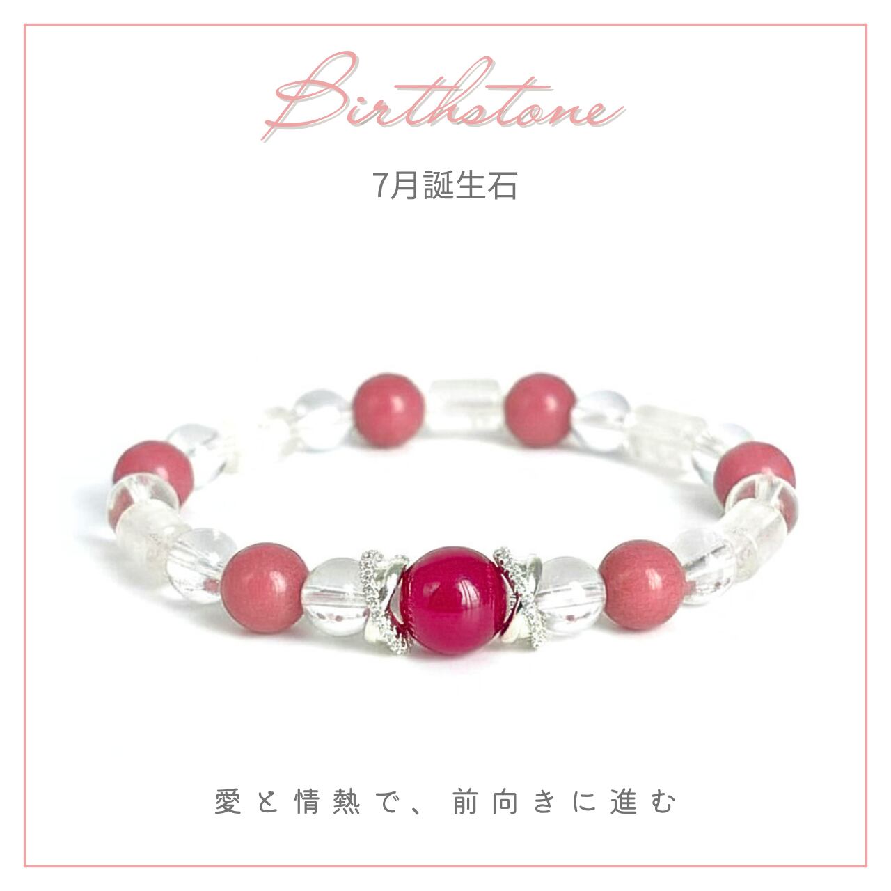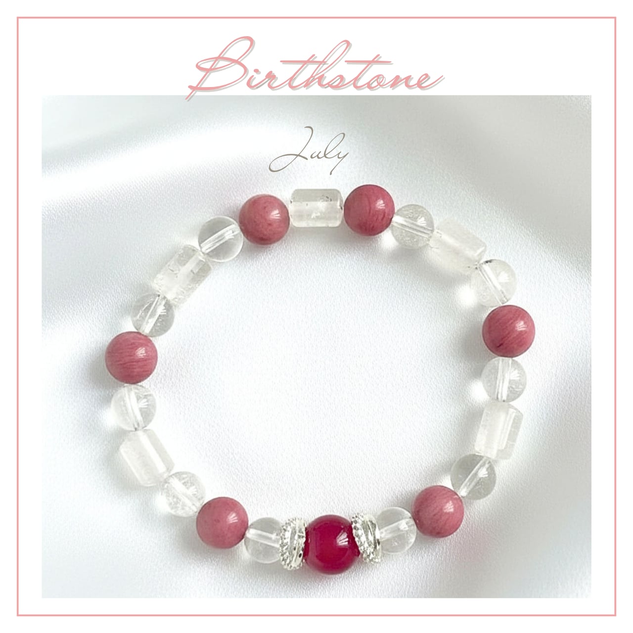 「7月誕生石ブレスレット」は、7月の誕生石であるルビー、ロードナイト、そして水晶を使用した魅力的なブレスレットです。このブレスレットは、身に着けることで心を穏やかにし、スピリチュアルなパワーを感じることができる特別なアイテムです。