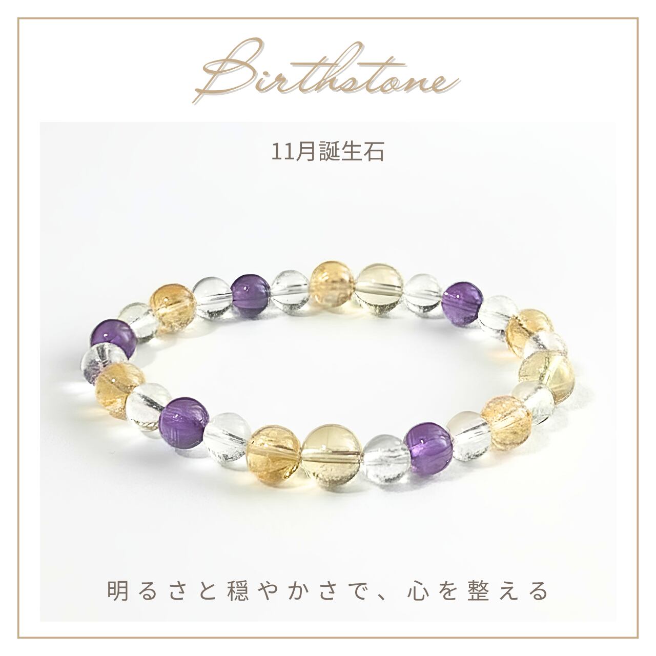 「☆11月生まれのあなたへ」は、11月の誕生石シトリンを中心に、アメジストと水晶を組み合わせた特別なブレスレットです。このアイテムは、身につけることで心の安定を図り、ポジティブなエネルギーを引き出す力を与えてくれます。