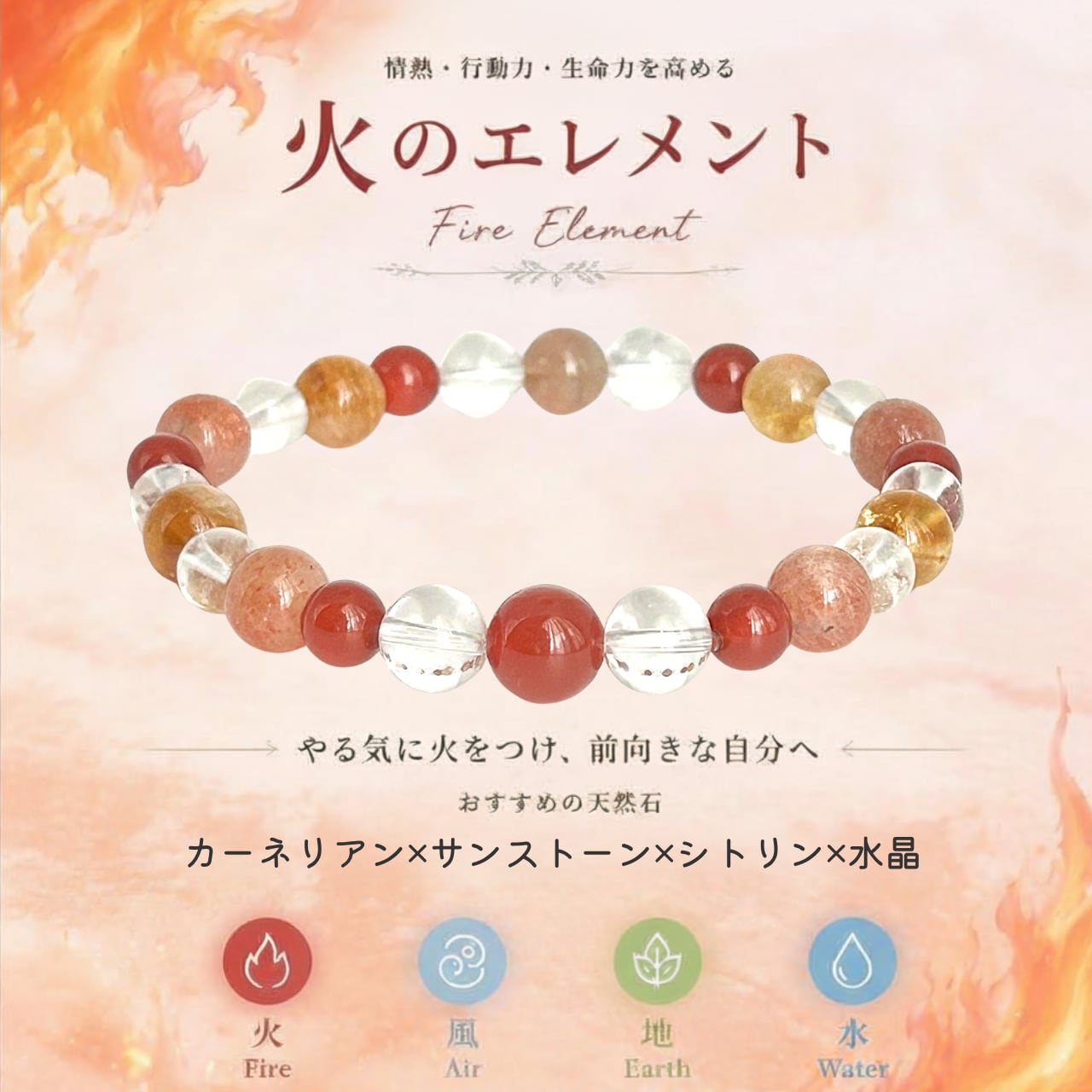 火エレメント「カーネリアン」を中心に、創造力を高めるサンストーン、明るいエネルギーをもたらすシトリン、そしてエネルギーを浄化する水晶を組み合わせた、情熱と活力を引き出す天然石ブレスレットです。