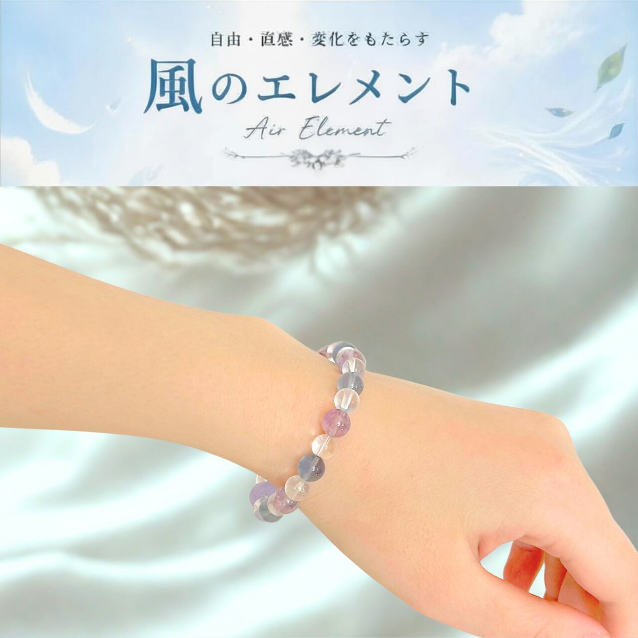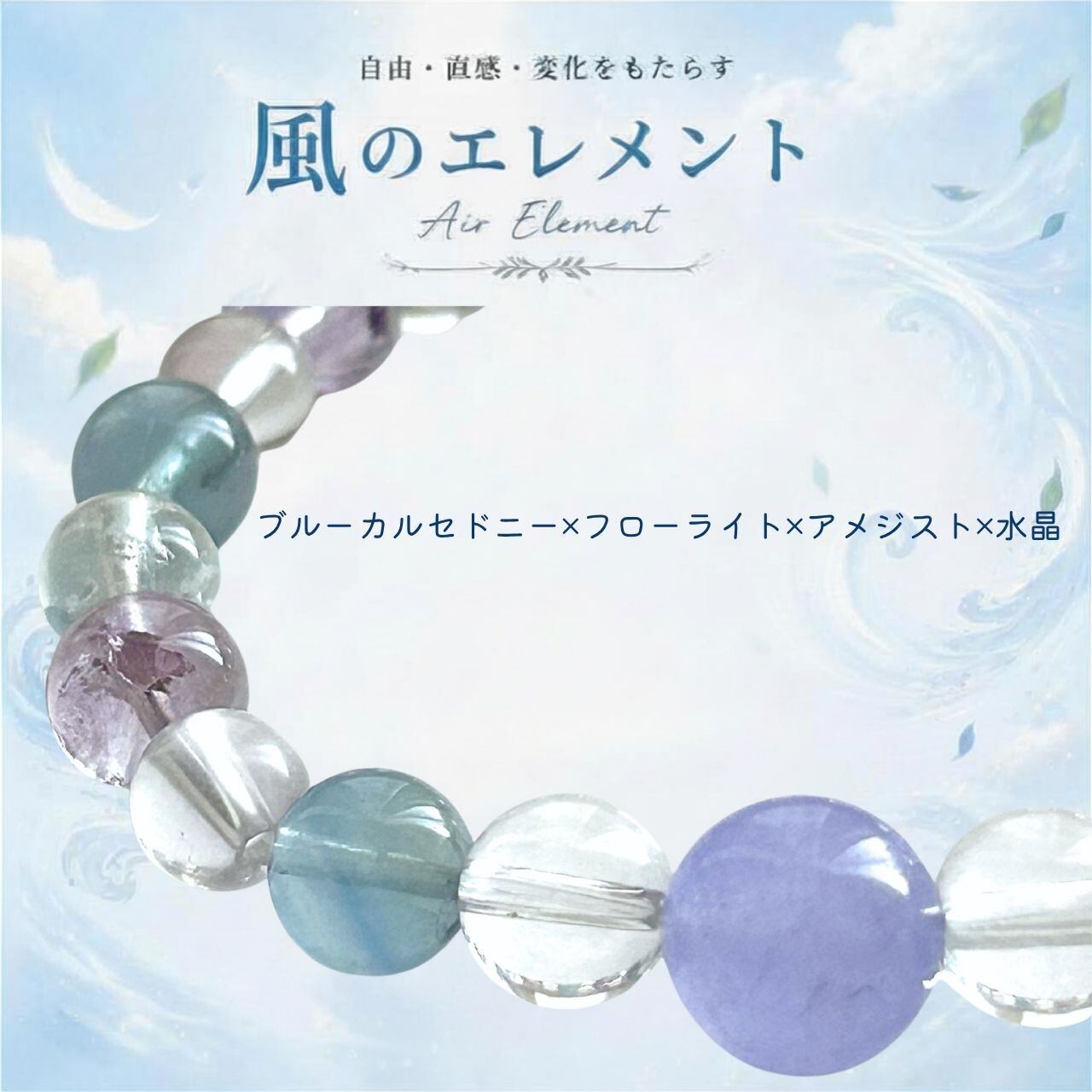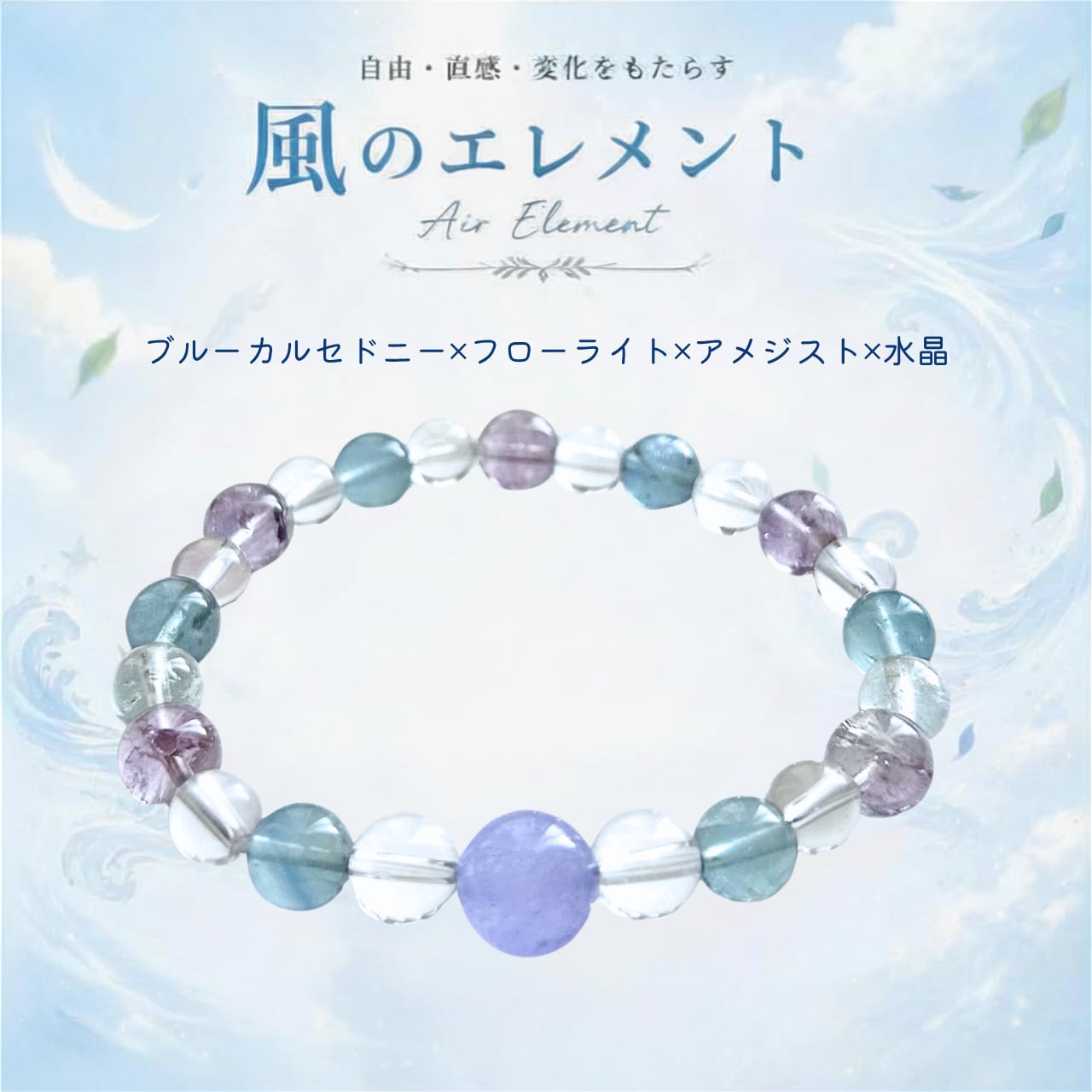 風エレメント「ブルーカルセドニー」を中心に、直感力を高めるアメジスト、思考を明確にするブルーフローライト、そしてエネルギーを浄化する水晶を組み合わせた、心を開放し、明晰さをもたらす天然石ブレスレットです。