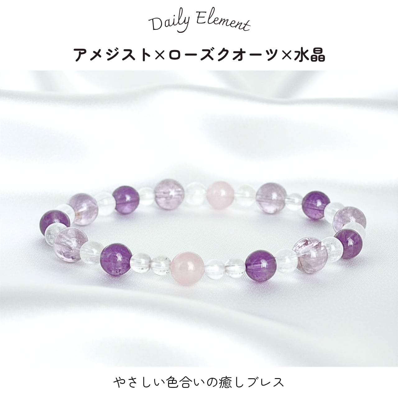アメジストの癒し、ラベンダーアメジストの穏やかさ、ローズクオーツの愛のエネルギー、水晶の浄化力が融合することで、あなたの日常がより豊かで穏やかなものになるブレスレットが完成しました。
