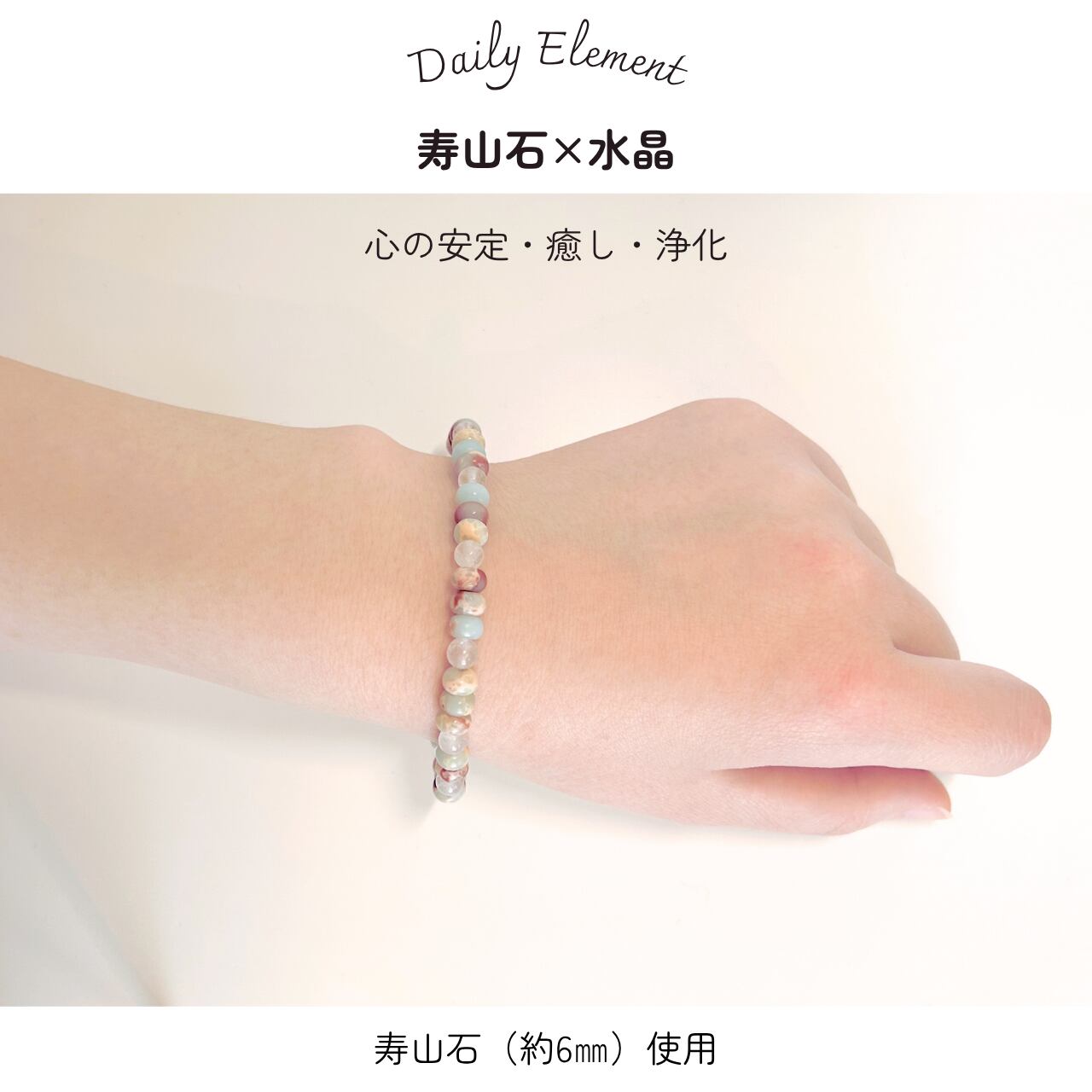 日常のアクセントにぴったりなこのブレスレットは、寿山石が持つ癒しのエネルギーと水晶の浄化力を融合させています。リラックスしながら、エネルギーの循環を感じることができるでしょう。